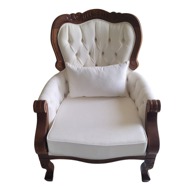 A base da Poltrona Imperador é feita de madeira maciça, proporcionando uma estrutura estável e resistente. Os pés da poltrona possuem acabamentos refinados que complementam o design geral, adicionando um toque de classe. Este cuidado com os materiais e o acabamento garante que a Poltrona Imperador seja uma peça de destaque em qualquer ambiente, seja em casa ou no escritório.